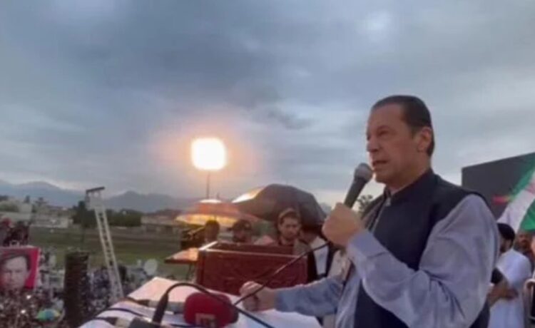 While talking to his supporters in the city of Khyber Pakhtunkhwa, the former prime minister stood under a rainy sky with dark clouds visible above the place of the rally.