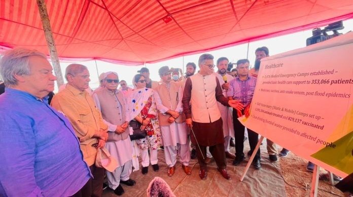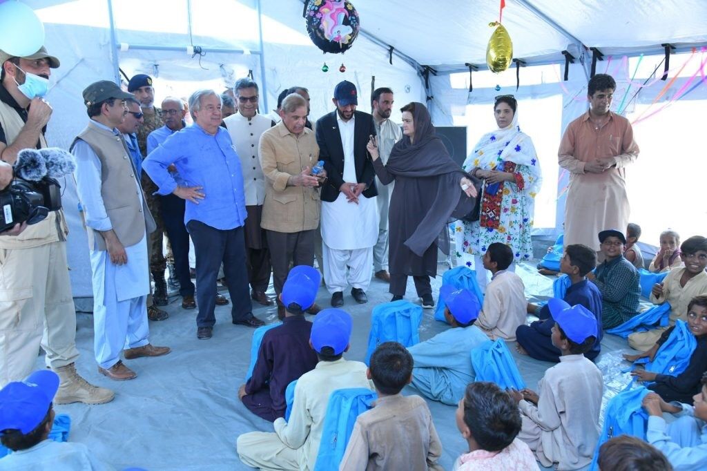 During their trip to the tent city Usta Muhammad, PM Muhammad Shehbaz Sharif, and UN Secretary-General Antonio Guterres also talked to people who had been hurt by the flood. Ministers from the federal government also went with them.